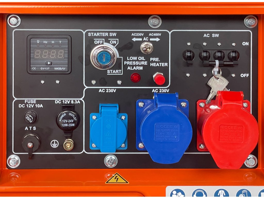 Široká výbava zásuvek včetně 32A průmyslové pro odběr plného výkonu na 230V a 12V DC pro nabíjení baterií.