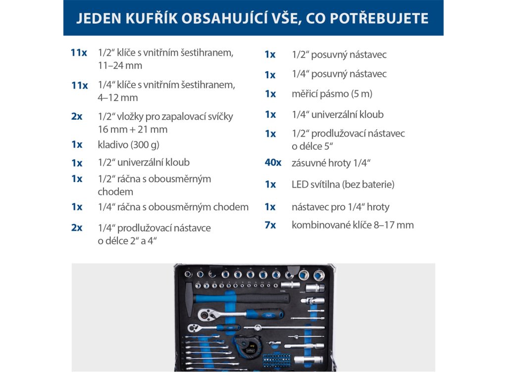 Hliníkový kufr s nářadím Scheppach TB 200 je komplexní řešení pro každého, kdo chce mít své nářadí v dokonalém pořádku a připravené k okamžitému použití. Obsahuje 141 pečlivě vybraných dílů, které pokryjí 99 % běžných oprav a montáží v domácnosti, dílně nebo při kempování. Každý kus nářadí je vyroben z vysoce kvalitní chrom-vanadiové oceli (Cr-V) a disponuje ergonomickou rukojetí s protiskluzovou zónou. Robustní hliníkový kufr s vyztuženými rohy a kovovými přezkami zajišťuje, že vaše investice bude v bezpečí i při častém přenášení, zatímco přesné výlisky uvnitř kufru skoncují s nekonečným hledáním zapadlého klíče.