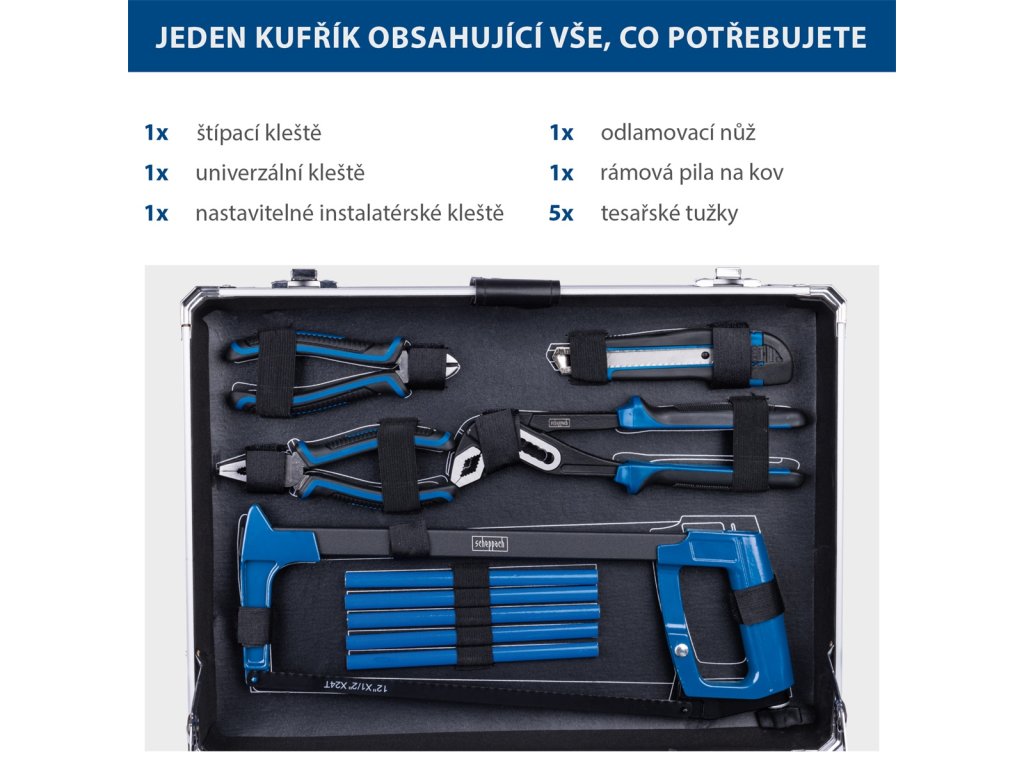 Kombinačky, štípačky, instalatérské kleště, nůž (vč. 10 čepelí) a pilka na kov