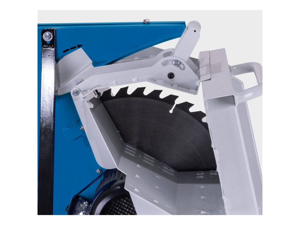 Celokovový kryt se pohybuje synchronizovaně s kolébkou, takže kotouč je odhalen pouze v místě řezu.