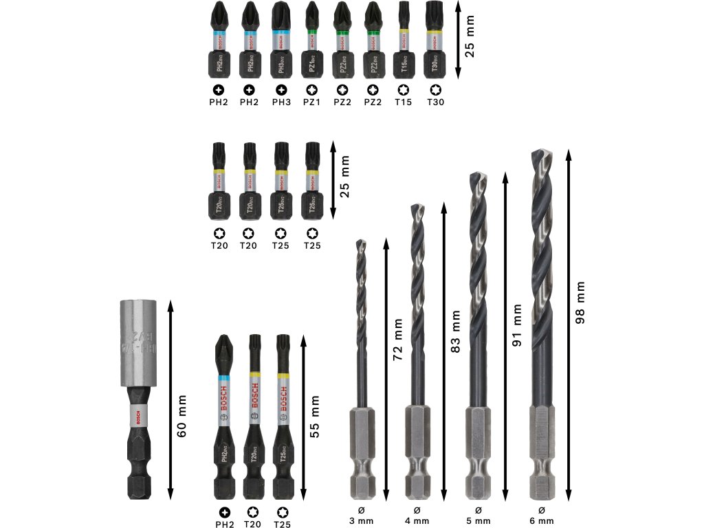 - Kombinovaná 20dílná sada: Obsahuje 15 šroubovacích bitů Impact Control (PH, PZ, T) ve dvou délkách, 4 vrtáky do kovu HSS-G a standardní magnetický držák bitů.