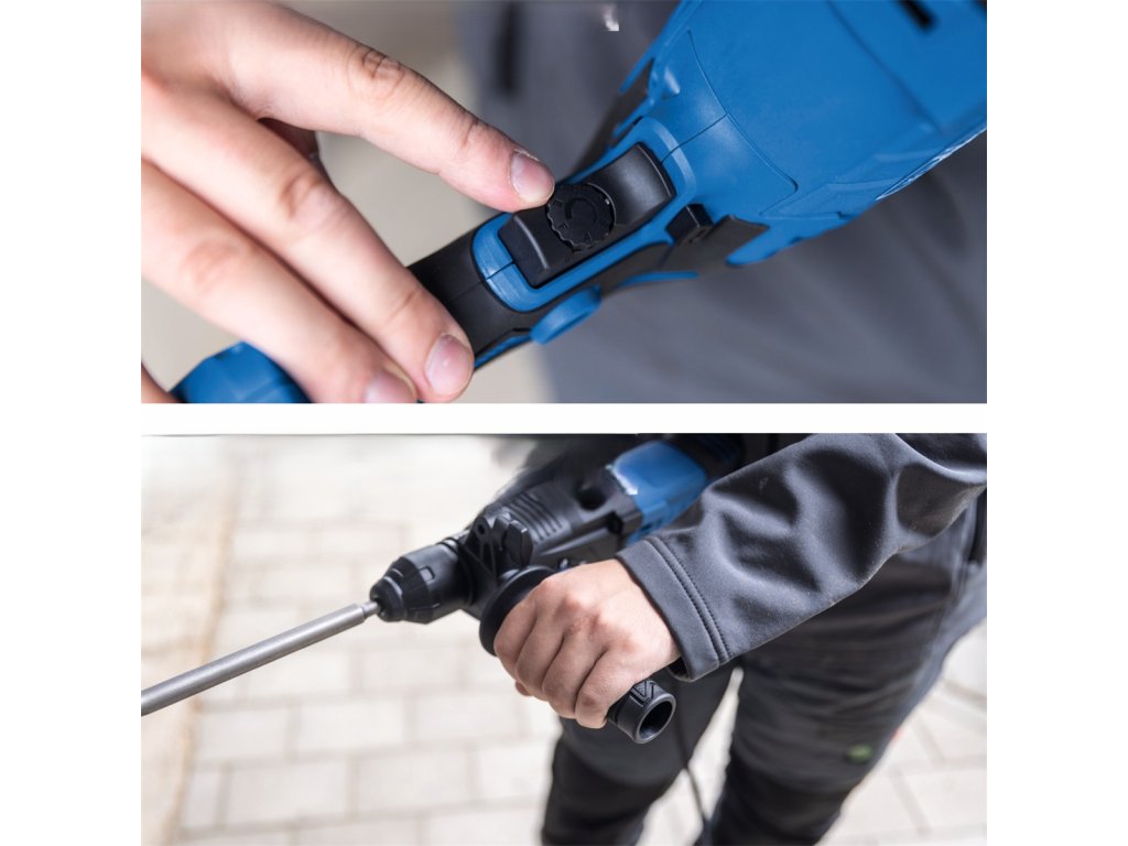 Kladivo disponuje čtyřmi režimy: 1. Vrtání bez příklepu (dřevo, kov), 2. Vrtání s příklepem (beton, cihla), 3. Sekání (bourací práce) a 4. Polohování sekáče, které vám umožní nastavit plochý sekáč do ideálního úhlu pro pohodlnou práci.