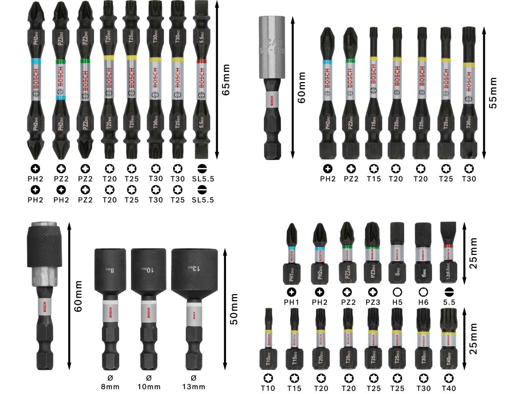 PH1, PH2, PZ2, PZ3, T10, T15, T20 (2×), T25 (2×), T30, T40, H5, H6, SL6,5