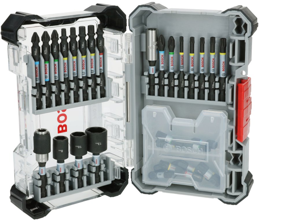 Sada šroubovacích bitů a příslušenství Bosch PRO Impact s 35 kusy představuje vrchol univerzálnosti a odolnosti pro nejnáročnější profesionální nasazení. Tato mimořádně obsáhlá sada je navržena tak, aby poskytla kompletní řešení pro široké spektrum šroubovacích a montážních úkolů. Každý šroubovací bit je vyroben z tepelně zpracované modifikované oceli a vybaven prodlouženou torzní zónou, která zajišťuje absorpci rázů a extrémní životnost, obzvláště při použití s rázovými utahováky. Sada obsahuje bohatý výběr bitů ve třech délkách (25 mm, 55 mm a oboustranné 65 mm), sadu nástrčných klíčů, a co je unikátní, hned dva typy držáků bitů – standardní magnetický a pokročilý rychloupínací Quick Change. Vše je precizně uloženo v robustním a flexibilním kufříku Pick and Click se systémem "box-in-box".