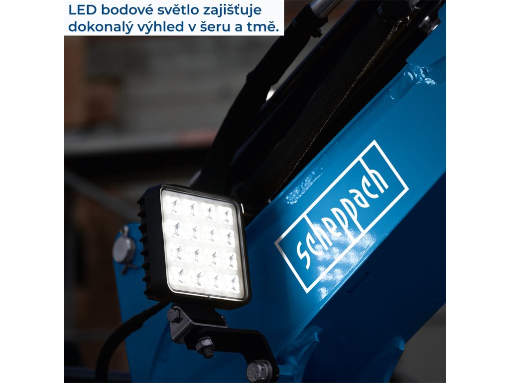 - Robustní gumové pásy a výkonné LED osvětlení pro práci za zhoršených podmínek.