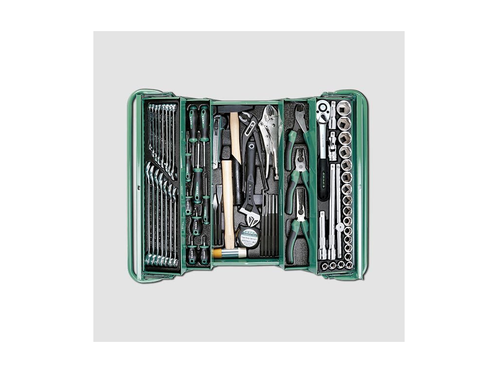18x 1/2" hlavice: 10,11,12,13,14,15,16,17,18,19,21,22,23,24,27,28,30,32mm 1/2" ráčna 3x 1/2" prodloužení: 75,125,250mm 1/2" vratidlo 1/2" kardan 15x očkoplochý klíč: 8,10,11,12,13,14,15,16,17,18,19,21,22,23,24mm 7x šroubovák: plochý 5,5x125, 6,5x150, 3,0x75, 4,0x100 křížový: 0x60, 1x80, 2x100 4x šroubovák krátký: 5,5x25, 6,5x25, 1x25, 2x25 kleště kombinované 180mm, kleště prodloužené 200mm, kleště boční štípací 180mm, nastavitelný klíč 250mm, plochý sekáč 15mm, špičatý sekáč 5mm,, průbojník 3,4,5,6,8mm důlčík 6mm palička 32mm, zámečnické kladivo 300g, siko kleště 240mm, samosvěrné kleště 224mm ulamovací nůž 165mm, svinovací 3 metrDoplňkové parametry