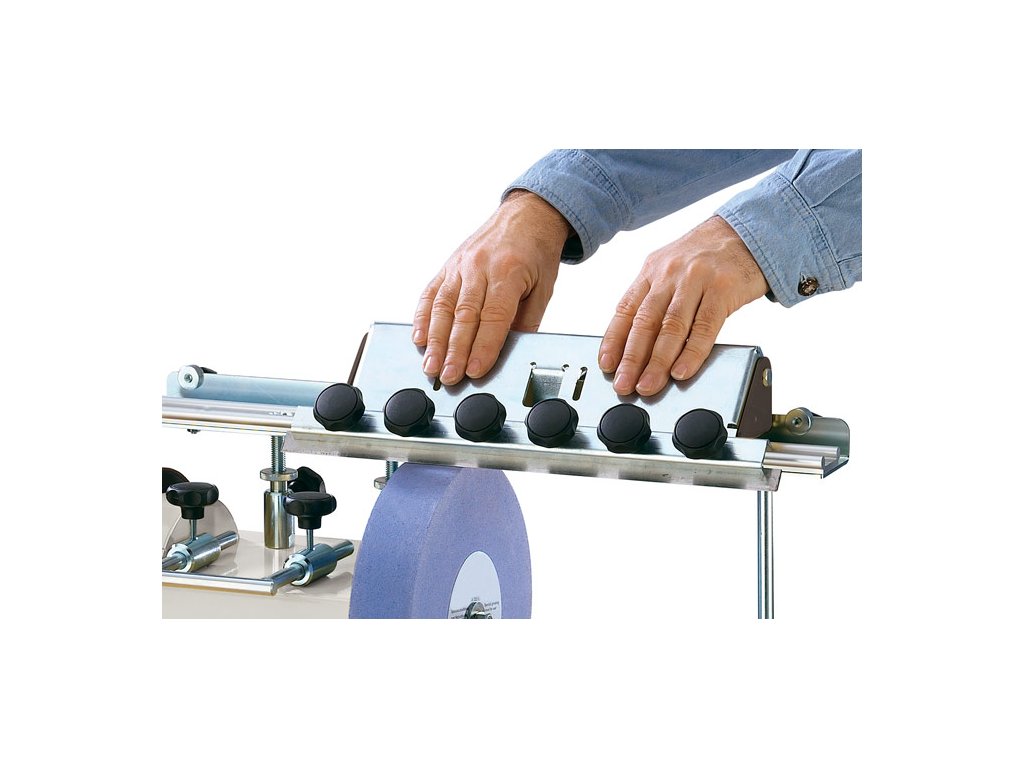 - Rovnoměrný úběr materiálu: Vodící lišta zajišťuje plynulý posuv po univerzální opěrce brusky, což eliminuje vznik "vln" na ostří, které jsou běžné při ručním broušení.