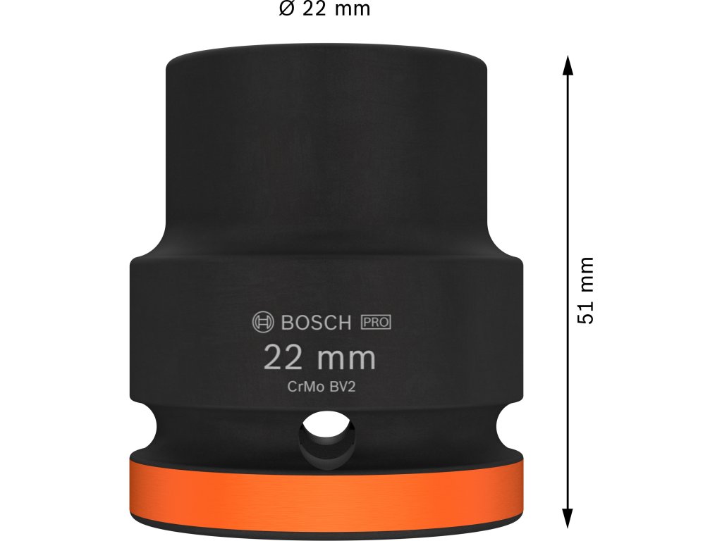 Průmyslová rázová nástrčná hlavice Bosch PRO Impact s upínáním 3/4", je zkonstruována pro nejextrémnější podmínky a nejnáročnější šroubovací operace v těžkém průmyslu, na stavbách velkých konstrukcí, při opravách nákladních vozidel a těžké techniky. Je navržena pro použití s vysoce výkonnými rázovými utahováky s 3/4" čtyřhranným upínáním, kde je potřeba spolehlivě pracovat se šestihrannými šrouby a maticemi velkých rozměrů. Vyrobena z tepelně zpracované chrom-molybdenové oceli (CRMO) a vybavena zesílenými stěnami, tato hlavice odolává masivním krouticím momentům a rázům. Černý fosfátový povlak poskytuje vynikající ochranu proti korozi, zatímco kombinace laserového a barevného značení usnadňuje rychlou identifikaci. Pro maximální bezpečnost je hlavice opatřena drážkou a průchozím otvorem pro zajištění na unašeči pomocí kolíku a O-kroužku.
