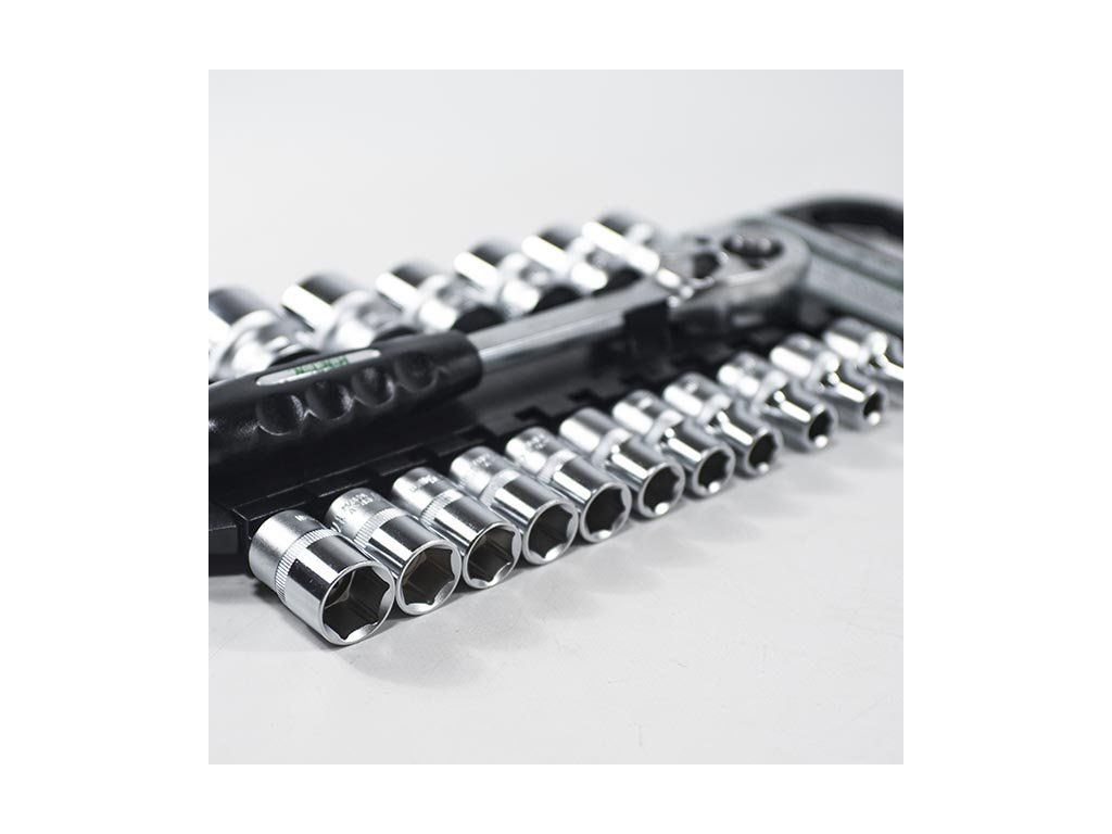 Gola sada Honiton 1/2" se 19 díly je „minimalistickým dravcem“ v dílenském vybavení. Zatímco velké sady často obsahují díly, které nikdy nepoužijete, tento set nabízí pouze to, co mechanik skutečně potřebuje k povolení těch nejtěžších spojů. Hlavním pilířem je silová ráčna s 36 zuby, která je v profesionální sféře ceněna pro svou schopnost „urvat“ i zarezlý šroub bez poškození vnitřního mechanismu. S upínacím čtyřhranem 1/2" a ucelenou řadou ořechů, která začíná na drobných 8 mm a končí u 32 mm (standard pro nápravy), získáte nástroj, který přežije generace.