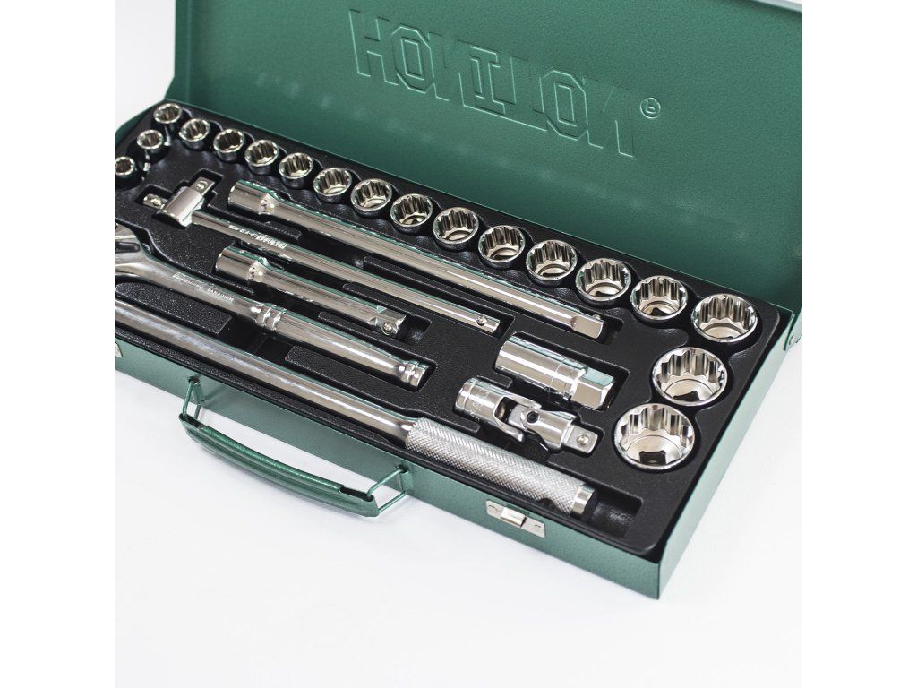 Gola sada Honiton 1/2" se 25 díly je navržena pro maximální spolehlivost při silové mechanice. Na rozdíl od přeplněných kombinovaných sad se tento set soustředí na nekompromisní kvalitu 1/2" systému. Upínací čtyřhran 12,7 mm v kombinaci s houževnatou CrV ocelí dovoluje bezpečný přenos vysokých krouticích momentů, které jsou u kol a podvozků nezbytné. Hlavním trumfem je ráčna s 36 zuby – ta je záměrně konstruována s hrubším ozubením, aby snesla brutální zacházení a "utržení" zarezlých šroubů, kde by jemnější mechanismy selhaly. Sadu doplňuje masivní vratidlo a dva svíčkové klíče, což z ní dělá ideálního společníka pro údržbu osobních i dodávkových vozů.