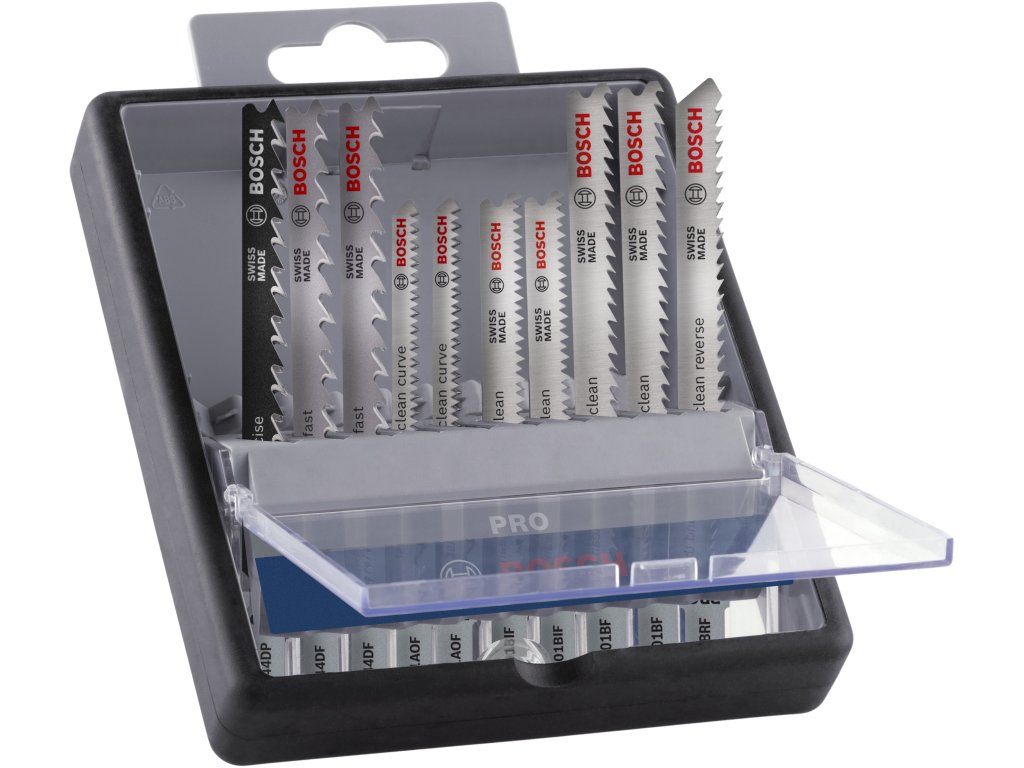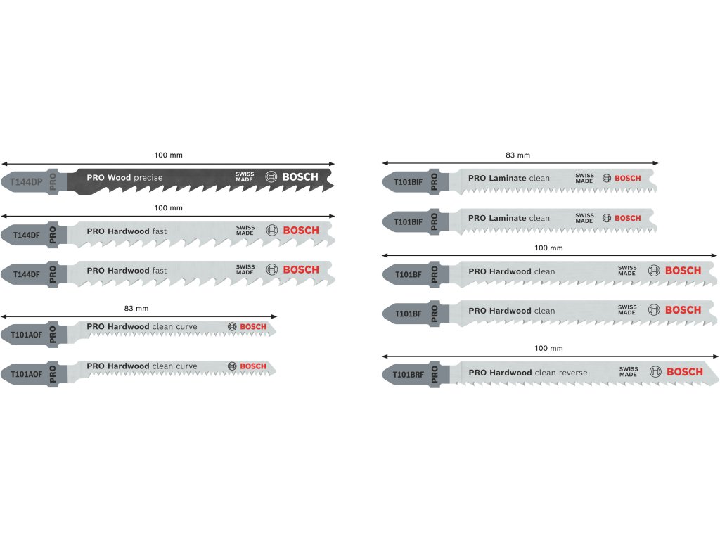 Sada pilových plátků Bosch PRO Hardwood and Laminate je navržena s ohledem na potřeby podlahářů, truhlářů a všech řemeslníků, kteří vyžadují dlouhou životnost a vynikající kvalitu řezu v tvrdém dřevě a laminátových materiálech. Tato 10dílná sada obsahuje pečlivě vybranou kombinaci pilových plátků pro přímočaré pily, které umožňují provádět širokou škálu řezů – od rychlých a rovných, přes dokonale čisté, až po precizní křivkové řezy.