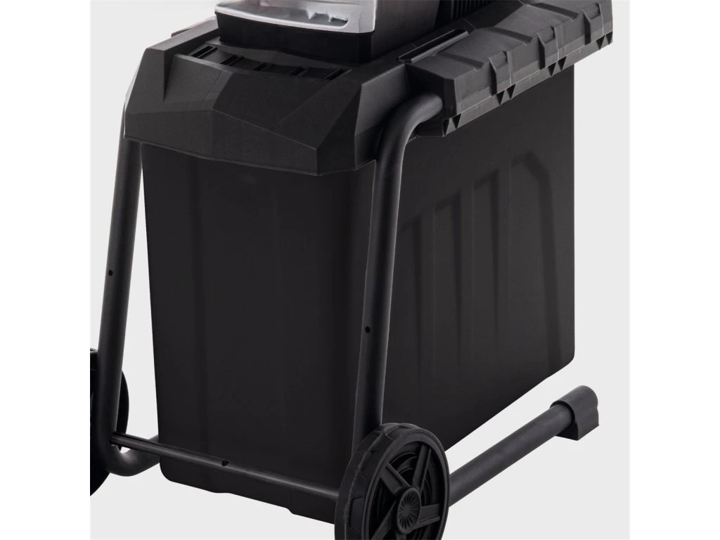 Transparentný 56l box dovoľuje sledovať stav naplnenia a zaisťuje, že sa drvič nespustí bez zbernej nádoby.