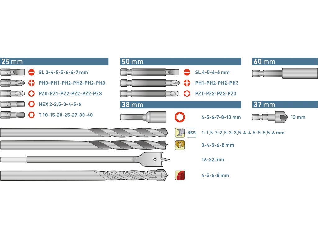 - vrtáky a hroty z kvalitnej CrV ocele a rýchloreznej HSS ocele