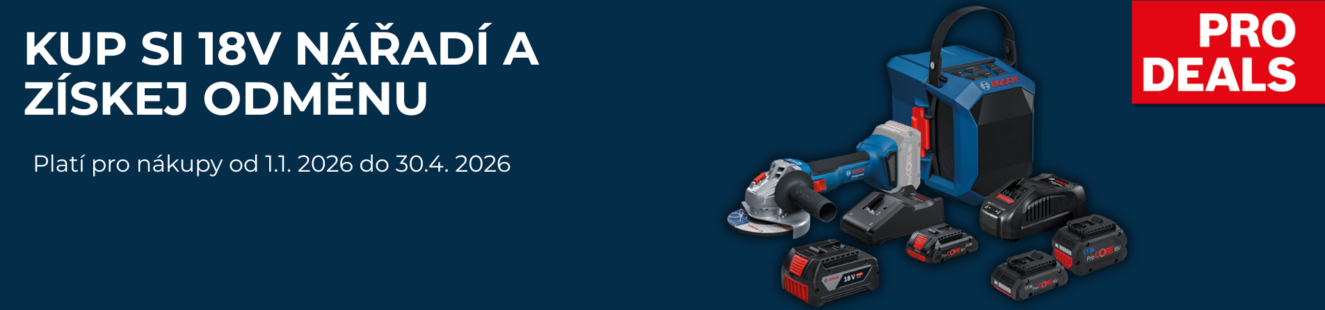Nakúp si náradie, záhradnú a meraciu techniku Bosch Professional 18V alebo akumulátory a nabíjačky za viac ako 363 € (bez DPH) a získaj zadarmo štartovaciu sadu ProCORE18V (1× 4.0Ah + GAL 18V-40) alebo akumulátorovú uhlovú brúsku GWS 18V-8. Ponáhľaj sa, odmeny sú dostupné iba do rozobrania.