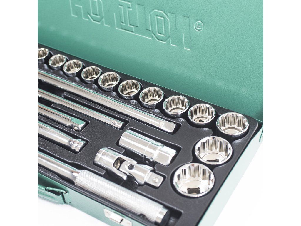 Gola sada Honiton 1/2" 25 dielov s 12-hranným profilom je nepostrádateľným vybavením pre každého mechanika, ktorý sa stretáva s náročnými opravami motorov a podvozkov. 12-hranný profil (bi-hex) ponúka oproti klasickému 6-hranu výhodu v jemnejšom odstupňovaní pri nasadzovaní na skrutku, čo oceníte najmä tam, kde nie je miesto na veľký švih račňou. Sada je vyrobená z vysoko kvalitnej ocele podľa prísnej normy DIN 3124 a jej súčasťou je aj kĺbové vratidlo – neoceniteľný nástroj na bezpečné povolenie spojov, na ktoré bežná račňa nestačí.