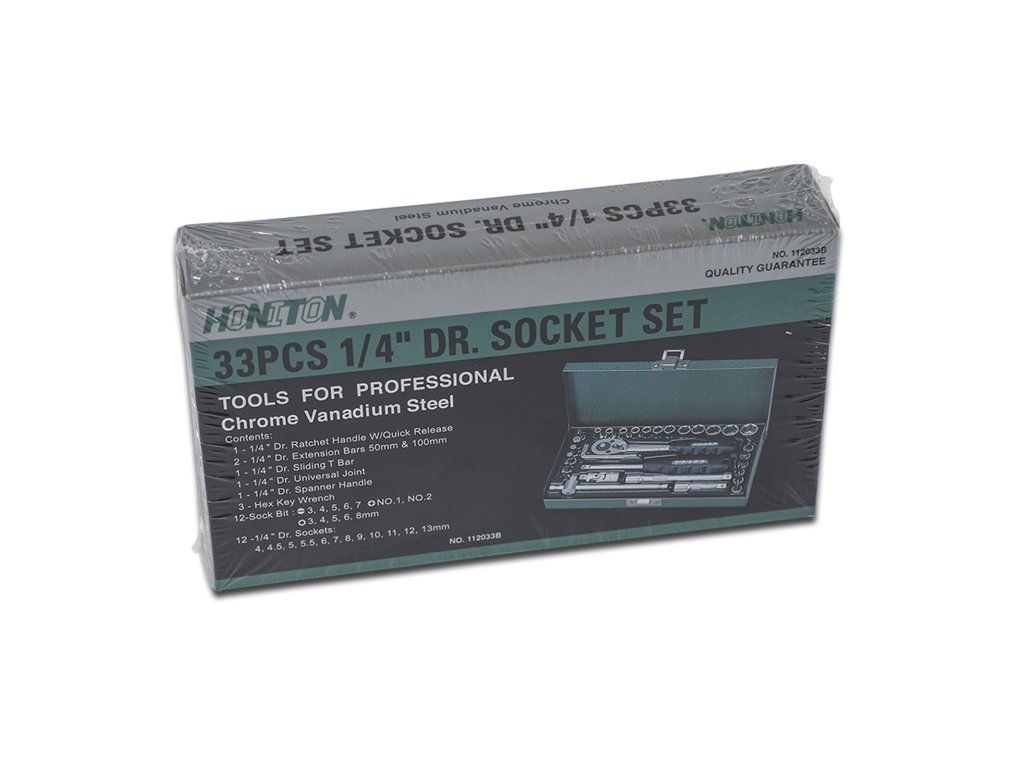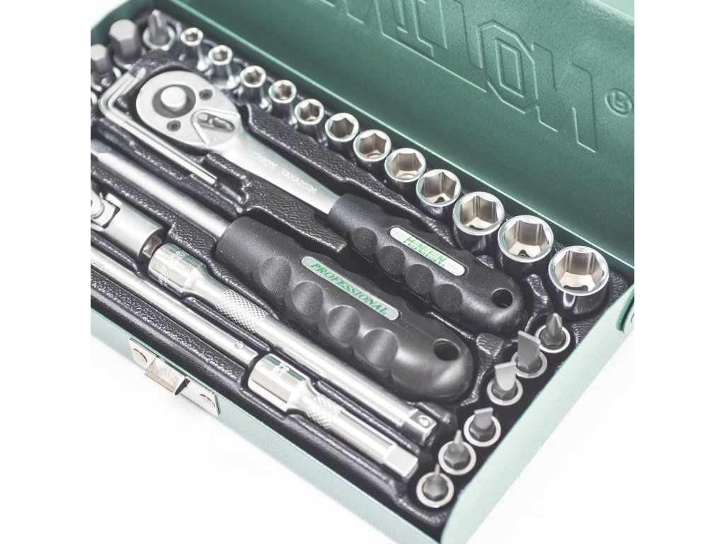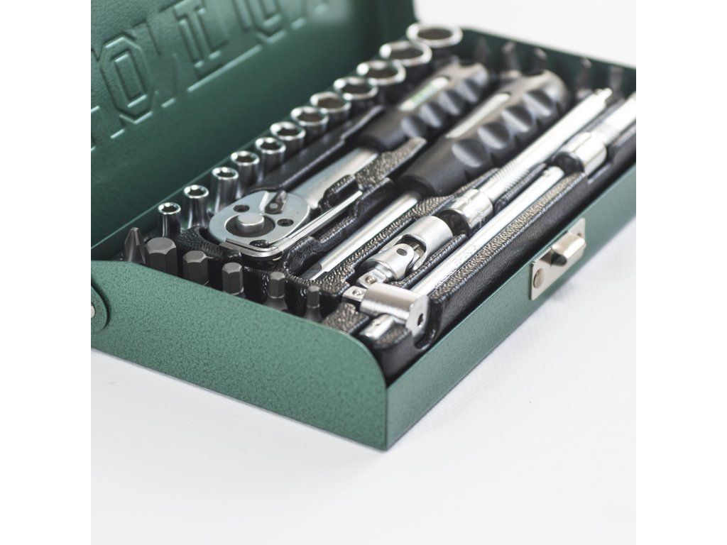 Gola sada Honiton 1/4" s 33 dielmi predstavuje vyvážený set pre jemnú a stredne náročnú mechaniku. Hlavným benefitom je upínací štvorhran 1/4", Ktorý umožňuje vyvinúť presne dávkovanú silu bez rizika strhnutia malých závitov. Srdcom sady je silová 36zubá račňa, ktorej mechanizmus vyniká mechanickou tuhosťou. Veľkým plusom je prítomnosť integrovaných zástrčných hlavíc (bitov), ktoré sú pevne nalisované v orechoch, čo eliminuje hľadanie malých bitov a ich vypadávanie z adaptérov. Vyrobené z húževnatej CrV ocele s precíznou kalibráciou podľa normy DIN 3124.