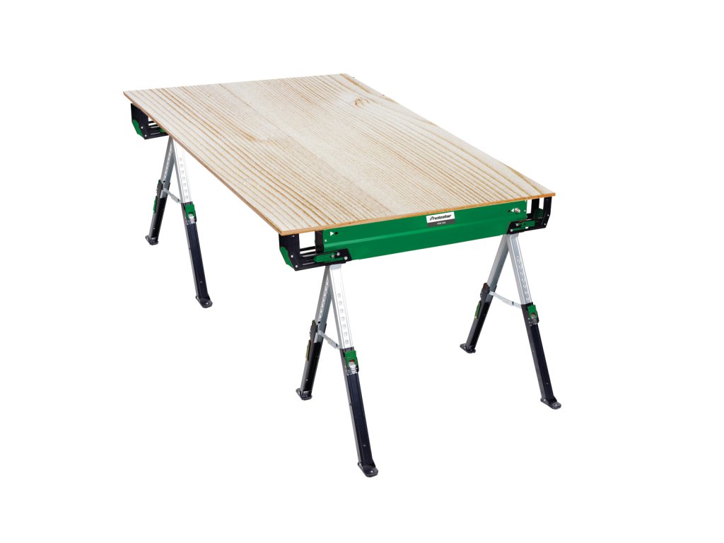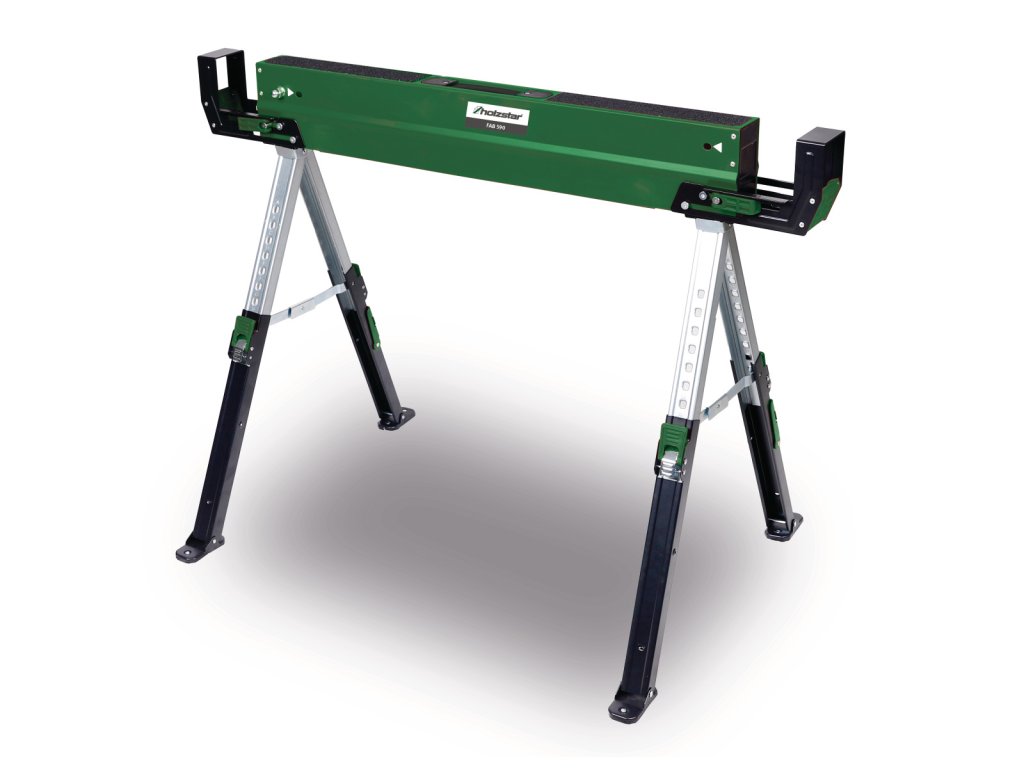 Na koncích podpěry jsou vyklápěcí ramena. Pokud do nich vložíte dva dřevěné hranoly o šířce do 90 mm, propojíte dvě podpěry dohromady a na hranoly můžete položit pracovní desku.