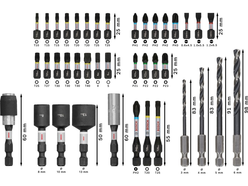 PH1, PH2 (3×), PH3, PZ1, PZ2 (2×), PZ3, T10, T15 (2×), T20 (3×), T25 (3×), T27, T30 (3×), T40, H4, H5, SL4,5, SL5,5, SL6,5