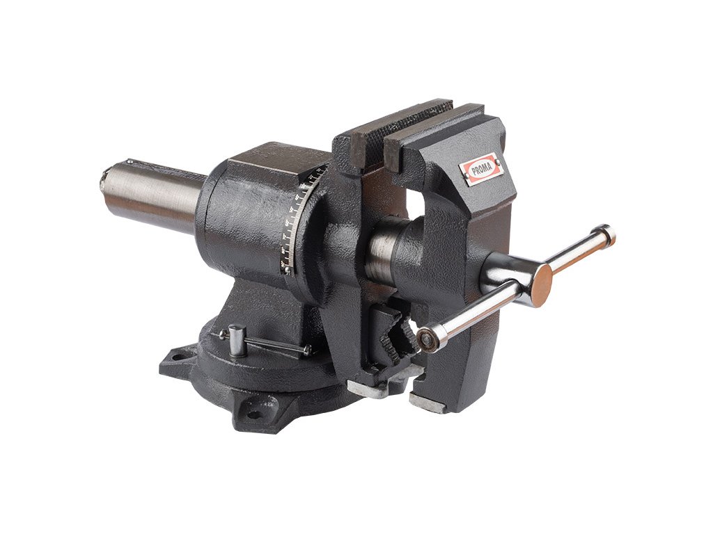 Model PROMA VS-100 boří limity klasických pevných svěráků. Jeho hlavní zbraní je dvouosé polohování: celou hlavu svěráku můžete otáčet kolem horizontální osy o plných 360°, což umožňuje brousit nebo pilovat materiál z boku či zespodu bez nutnosti jeho vyjmutí. Zároveň lze svěrák v základně natočit horizontálně o 90°. Čelisti z vysoce kvalitní oceli jsou kaleny na 45 HRC, což zaručuje extrémní odolnost proti opotřebení a bezpečný úchop i při velkém tlaku. Pro instalatéry a údržbáře je svěrák na spodní straně hlavy vybaven integrovanými čelistmi pro trubky, které fixují kulatý materiál ve třech bodech.
